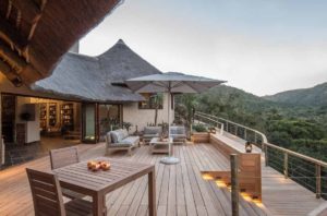 The chalets are perched on the edge of a cliff, rather like a beautifully appointed eagle’s eyrie, from where you have a view of the valley and the waterhole below. Sheer cliffs with inaccessible caves whisper of the padded paws of a leopard safely surveying the undulating hills and valleys for potential prey. Perhaps they, too, are just languidly enjoying the view…
